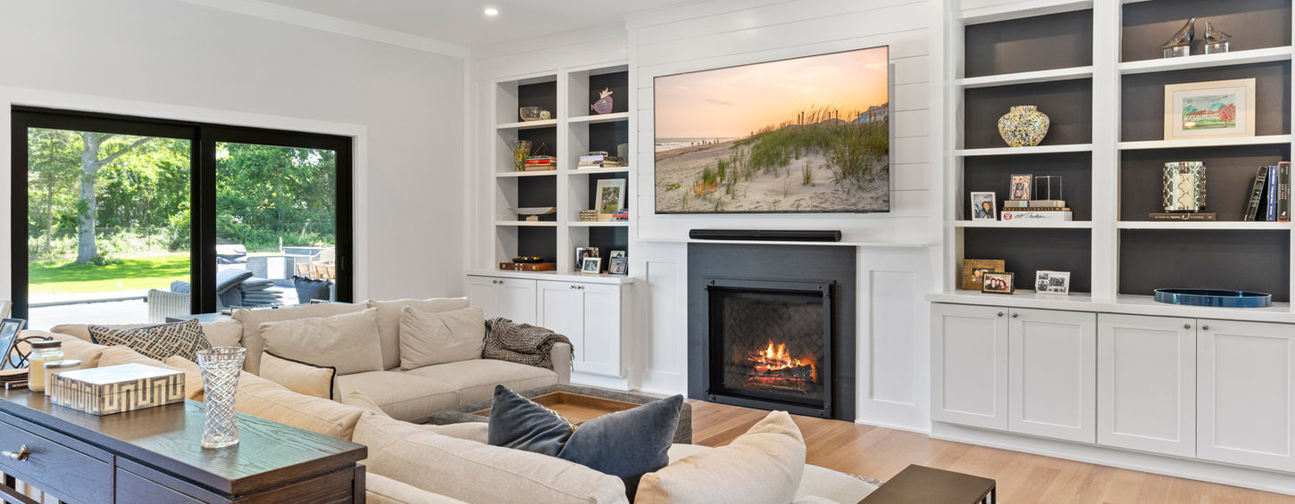 A spacious and inviting room featuring a coffered ceiling and large windows that fill the space with natural light. The room includes a fireplace with custom built-ins to finish the large space with warmth.